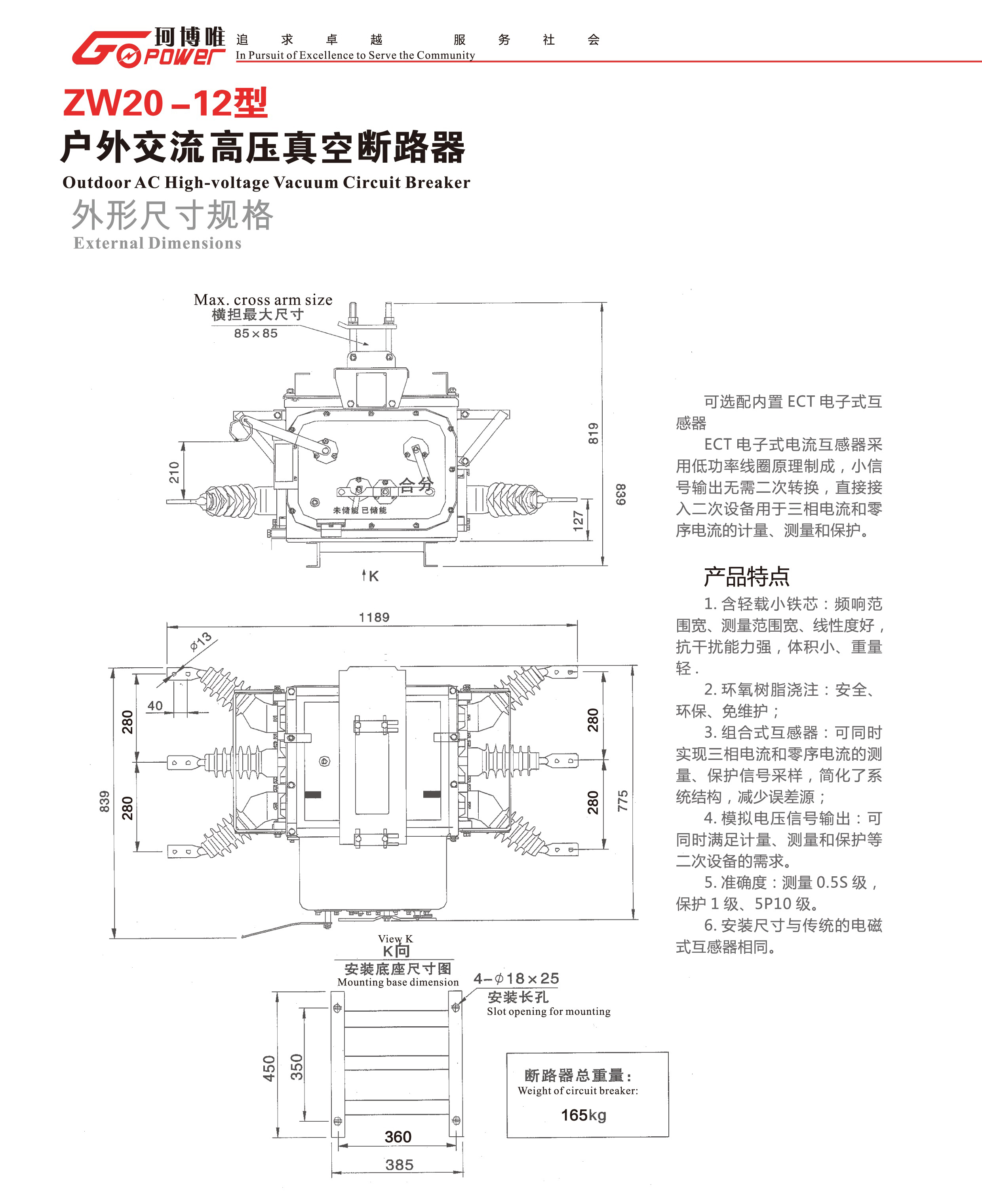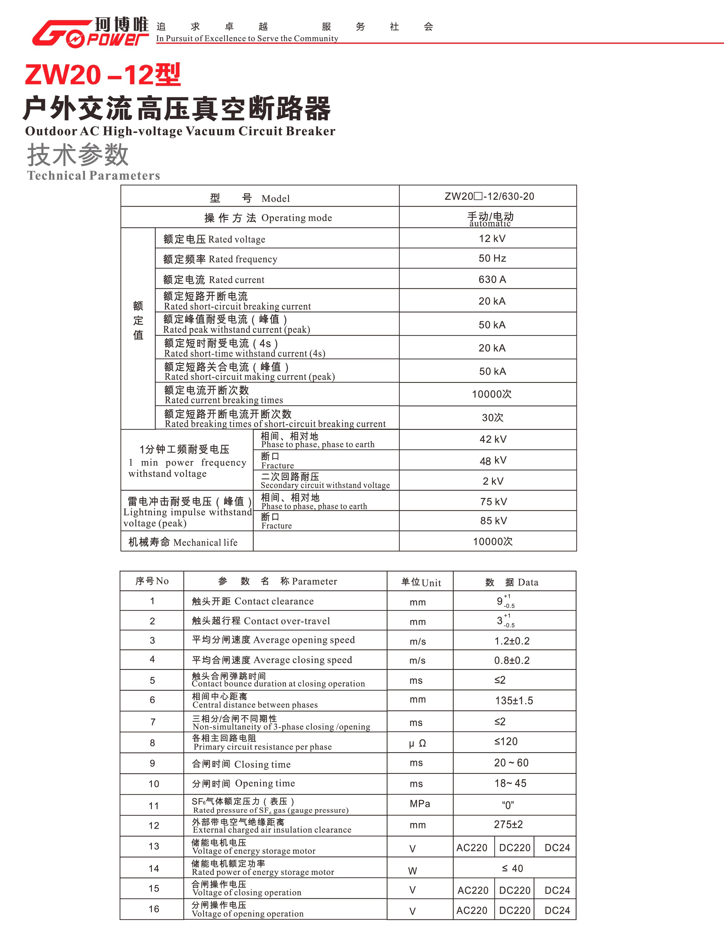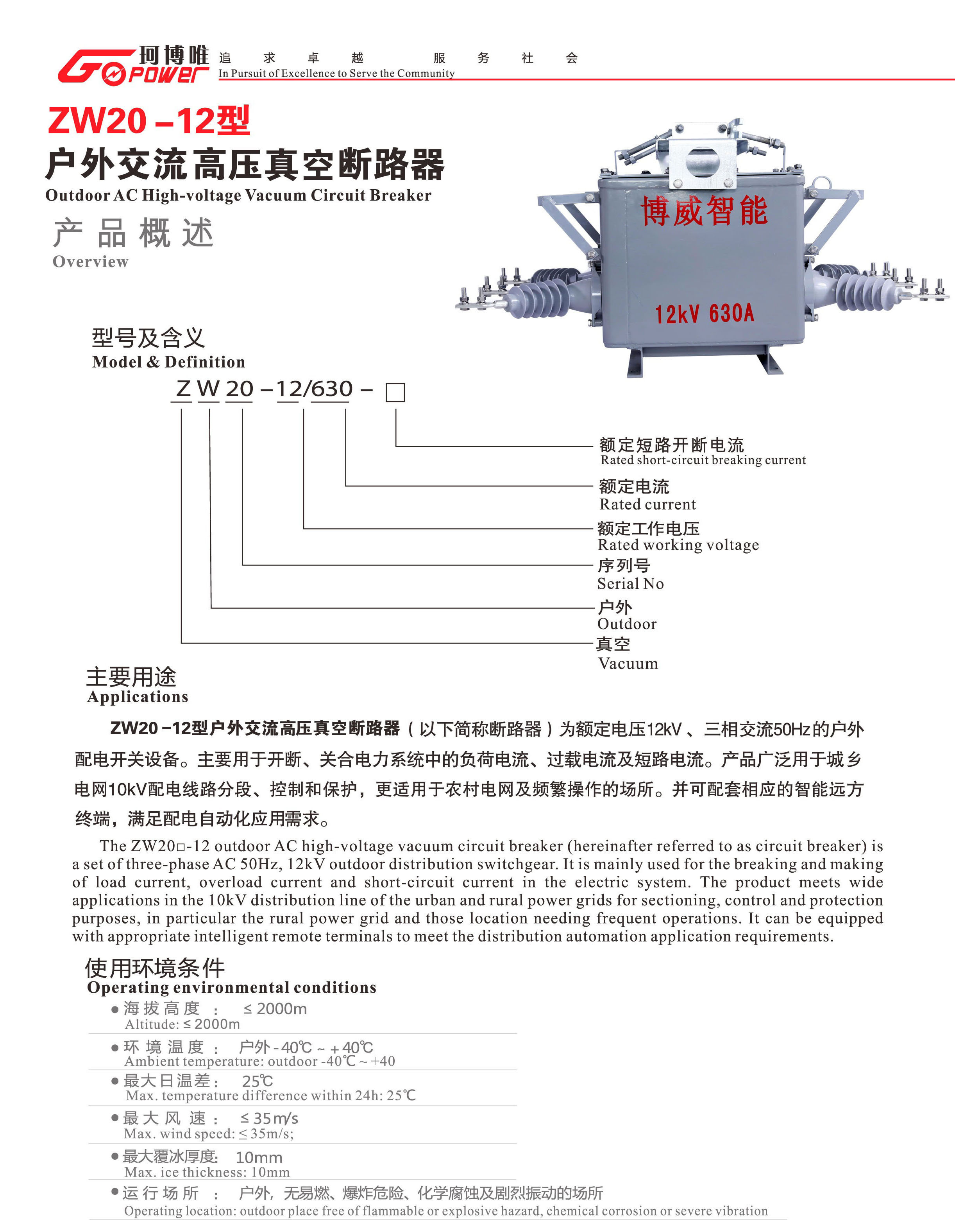 ZW20-12 戶外交流高壓真空斷路器為額定電壓12kV、三相交流50Hz的戶外配電開關設備。主要用于開斷、關合電力系統(tǒng)中的負荷電流、過載電流及短路電流??膳涮紫鄳闹悄苓h方終端,滿足配電自動化應用需求。